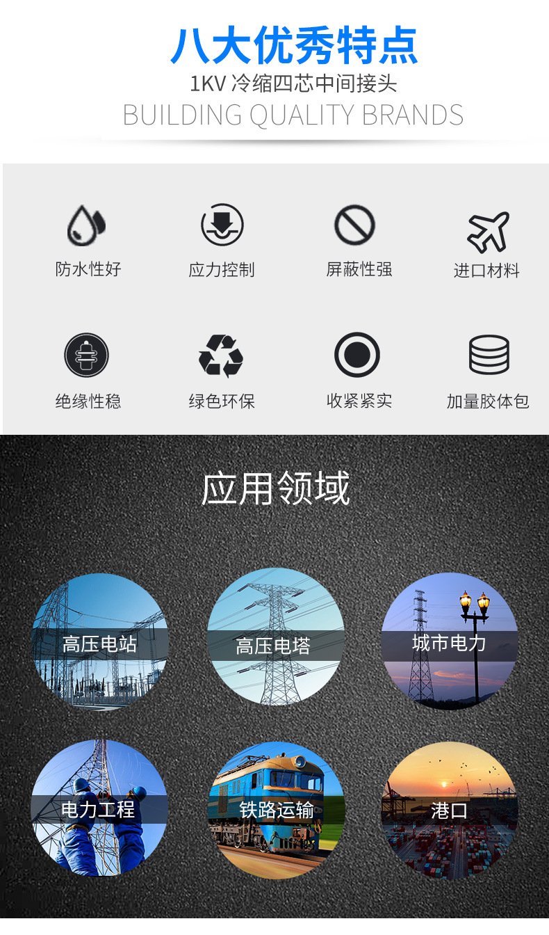 1KV、10KV、20KV、35KV熱縮電力電纜終端頭、中間接頭系列產(chǎn)品,集防水、應力控制、絕緣于一體。具有良好的電氣性能和機械性能,能在各種惡劣的環(huán)境條件下長(cháng)期使用。具有重量輕、安裝方便等優(yōu)點(diǎn)。廣泛地應用電力、石油化工、治金、鐵路港口和建筑領(lǐng)域。 熱縮電纜附件俗稱(chēng)熱縮電纜頭,廣泛用于35KV及熱縮電纜附件熱縮電纜附件以下電壓等級的交聯(lián)電纜或油浸電纜的中間連接和終端上。與傳統電纜附件相比具有體積小、重量輕、安全可靠、安裝方便等特點(diǎn)。產(chǎn)品符合GB11033標準,長(cháng)期使用溫度范圍為-55℃~105℃,老化壽命長(cháng)達20年,徑向收縮率≥50%,縱向收縮率<5%,收縮溫度為110℃~140℃。