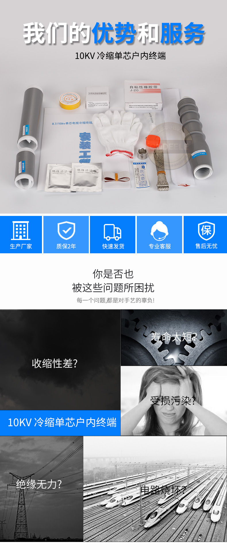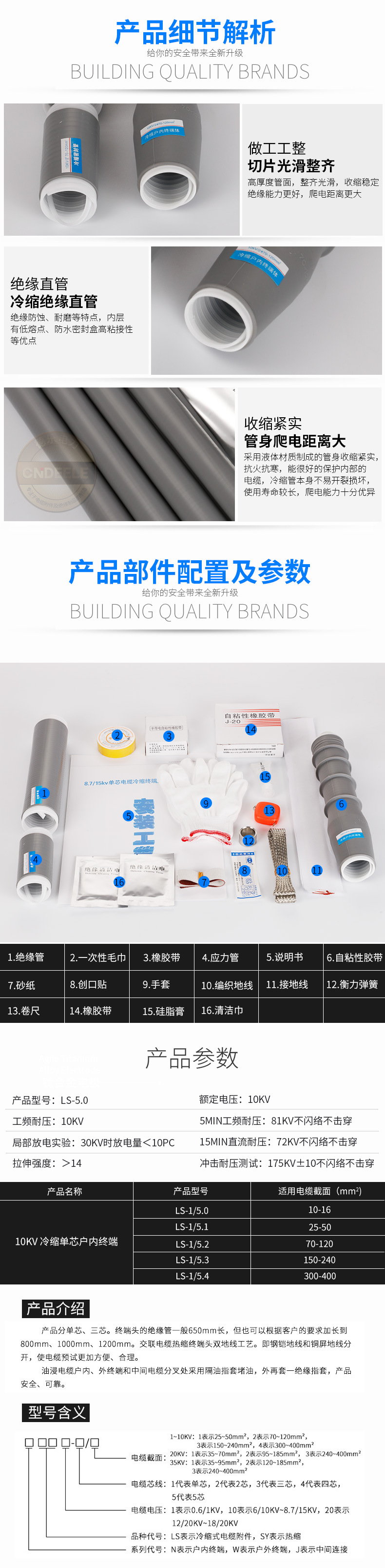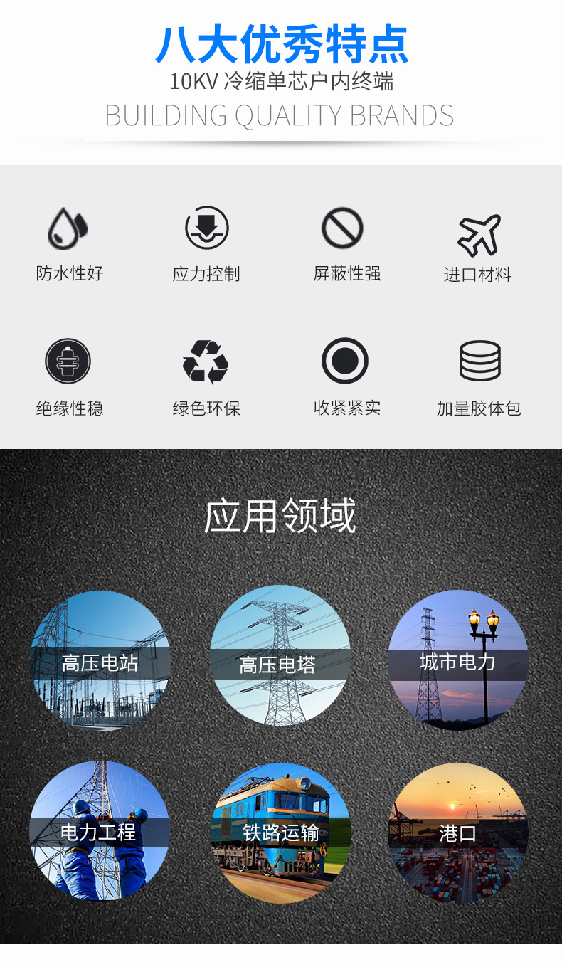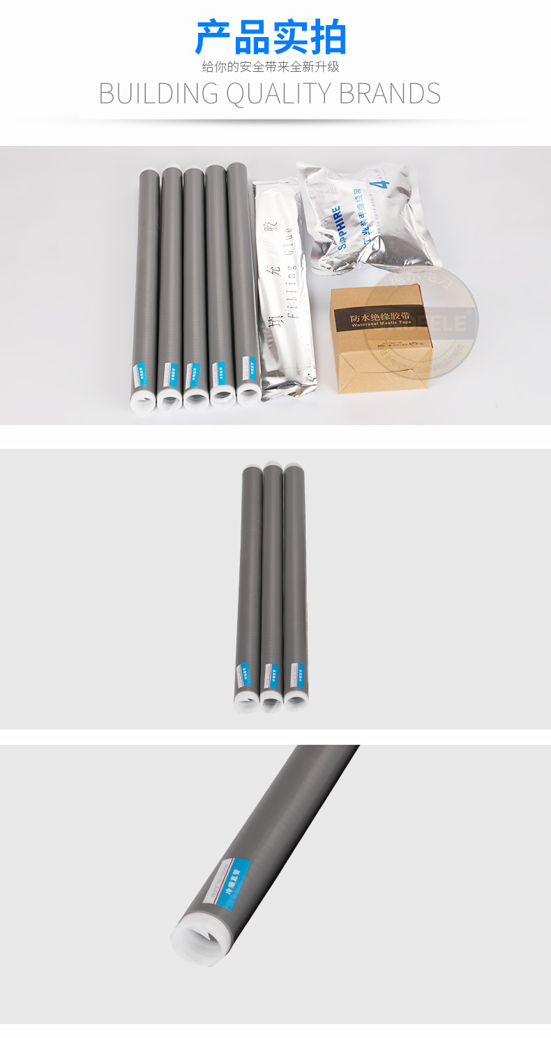 1KV、10KV、20KV、35KV熱縮電力電纜終端頭、中間接頭系列產(chǎn)品,集防水、應力控制、絕緣于一體。具有良好的電氣性能和機械性能,能在各種惡劣的環(huán)境條件下長(cháng)期使用。具有重量輕、安裝方便等優(yōu)點(diǎn)。廣泛地應用電力、石油化工、治金、鐵路港口和建筑領(lǐng)域。 熱縮電纜附件俗稱(chēng)熱縮電纜頭,廣泛用于35KV及熱縮電纜附件熱縮電纜附件以下電壓等級的交聯(lián)電纜或油浸電纜的中間連接和終端上。與傳統電纜附件相比具有體積小、重量輕、安全可靠、安裝方便等特點(diǎn)。產(chǎn)品符合GB11033標準,長(cháng)期使用溫度范圍為-55℃~105℃,老化壽命長(cháng)達20年,徑向收縮率≥50%,縱向收縮率<5%,收縮溫度為110℃~140℃。