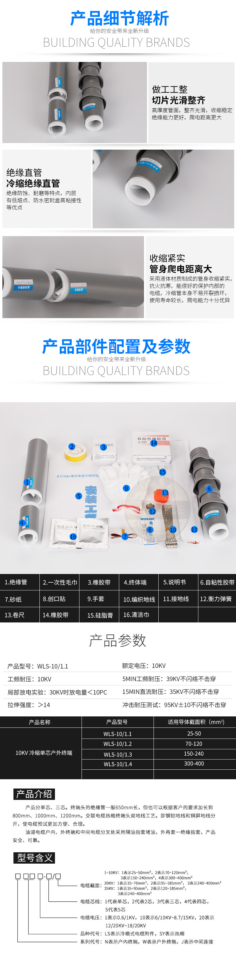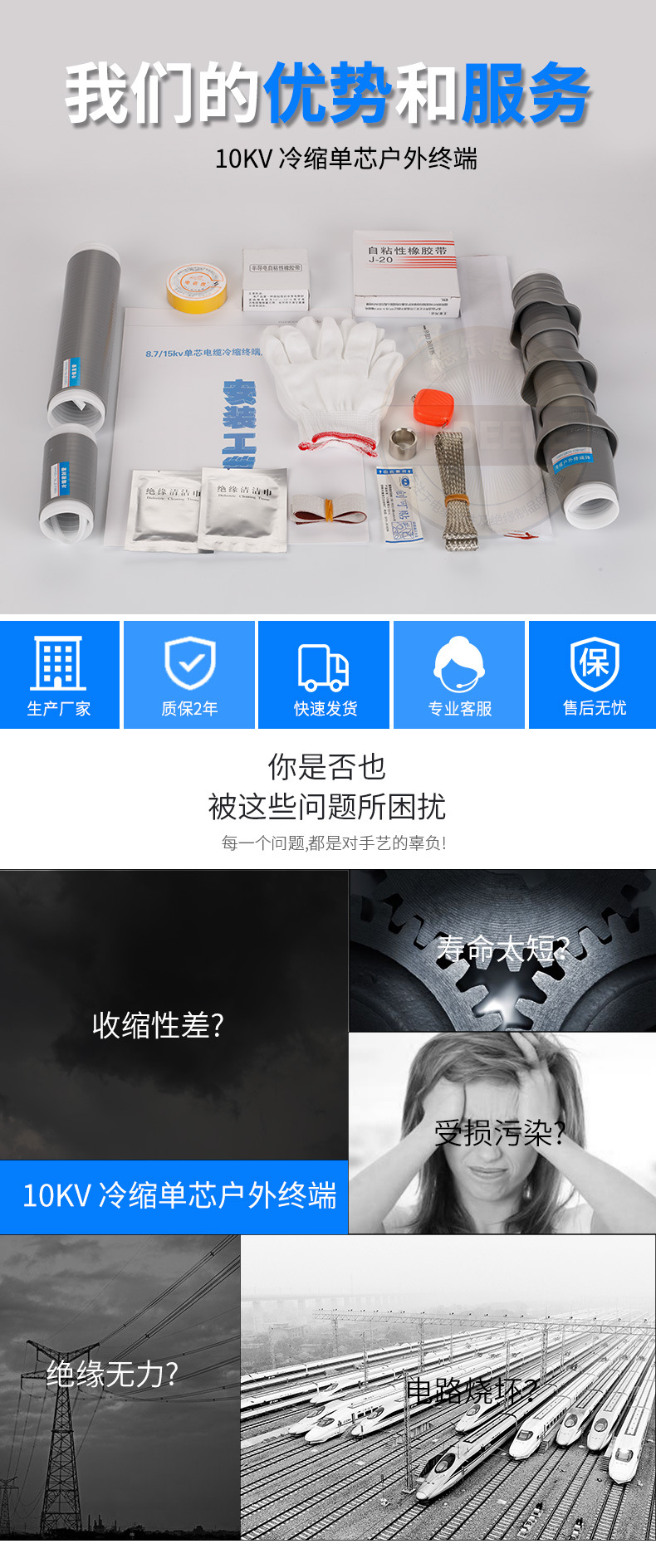 1KV、10KV、20KV、35KV熱縮電力電纜終端頭、中間接頭系列產(chǎn)品,集防水、應力控制、絕緣于一體。具有良好的電氣性能和機械性能,能在各種惡劣的環(huán)境條件下長(cháng)期使用。具有重量輕、安裝方便等優(yōu)點(diǎn)。廣泛地應用電力、石油化工、治金、鐵路港口和建筑領(lǐng)域。 熱縮電纜附件俗稱(chēng)熱縮電纜頭,廣泛用于35KV及熱縮電纜附件熱縮電纜附件以下電壓等級的交聯(lián)電纜或油浸電纜的中間連接和終端上。與傳統電纜附件相比具有體積小、重量輕、安全可靠、安裝方便等特點(diǎn)。產(chǎn)品符合GB11033標準,長(cháng)期使用溫度范圍為-55℃~105℃,老化壽命長(cháng)達20年,徑向收縮率≥50%,縱向收縮率<5%,收縮溫度為110℃~140℃。