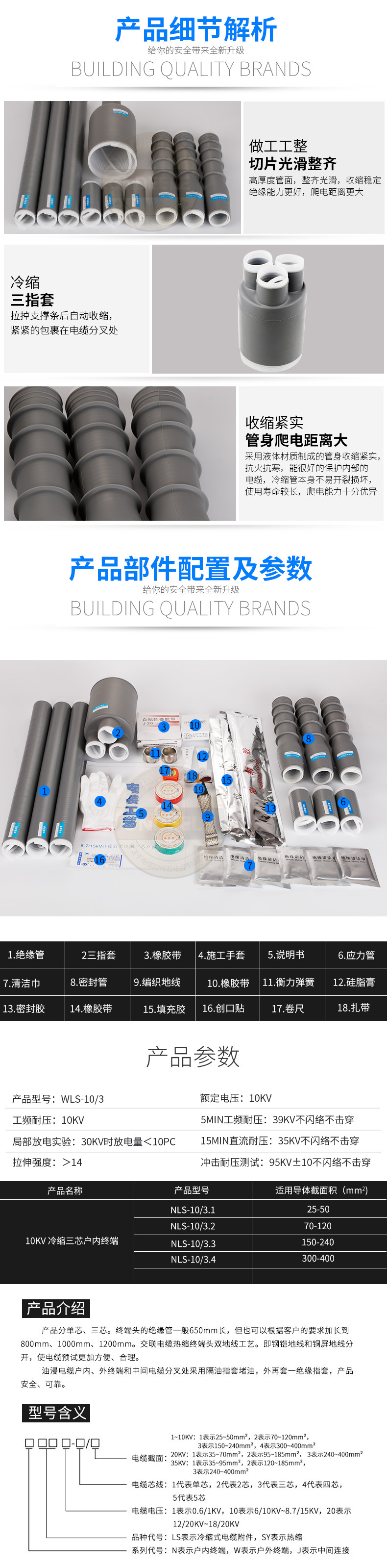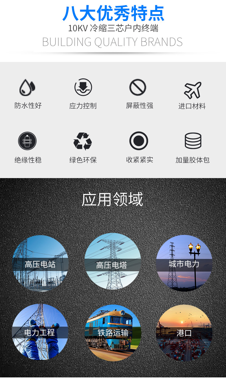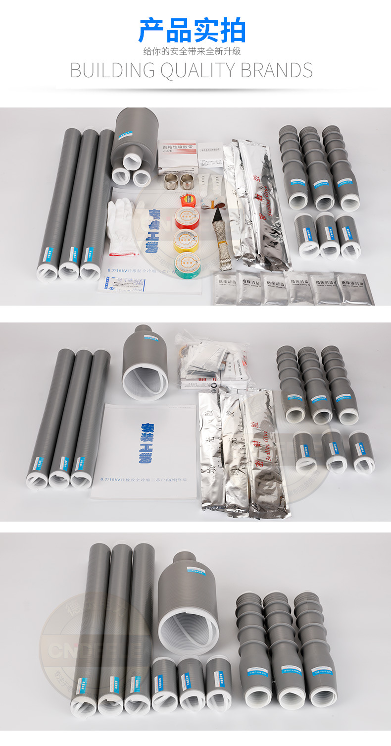 1KV、10KV、20KV、35KV熱縮電力電纜終端頭、中間接頭系列產(chǎn)品,集防水、應力控制、絕緣于一體。具有良好的電氣性能和機械性能,能在各種惡劣的環(huán)境條件下長(cháng)期使用。具有重量輕、安裝方便等優(yōu)點(diǎn)。廣泛地應用電力、石油化工、治金、鐵路港口和建筑領(lǐng)域。 熱縮電纜附件俗稱(chēng)熱縮電纜頭,廣泛用于35KV及熱縮電纜附件熱縮電纜附件以下電壓等級的交聯(lián)電纜或油浸電纜的中間連接和終端上。與傳統電纜附件相比具有體積小、重量輕、安全可靠、安裝方便等特點(diǎn)。產(chǎn)品符合GB11033標準,長(cháng)期使用溫度范圍為-55℃~105℃,老化壽命長(cháng)達20年,徑向收縮率≥50%,縱向收縮率<5%,收縮溫度為110℃~140℃。