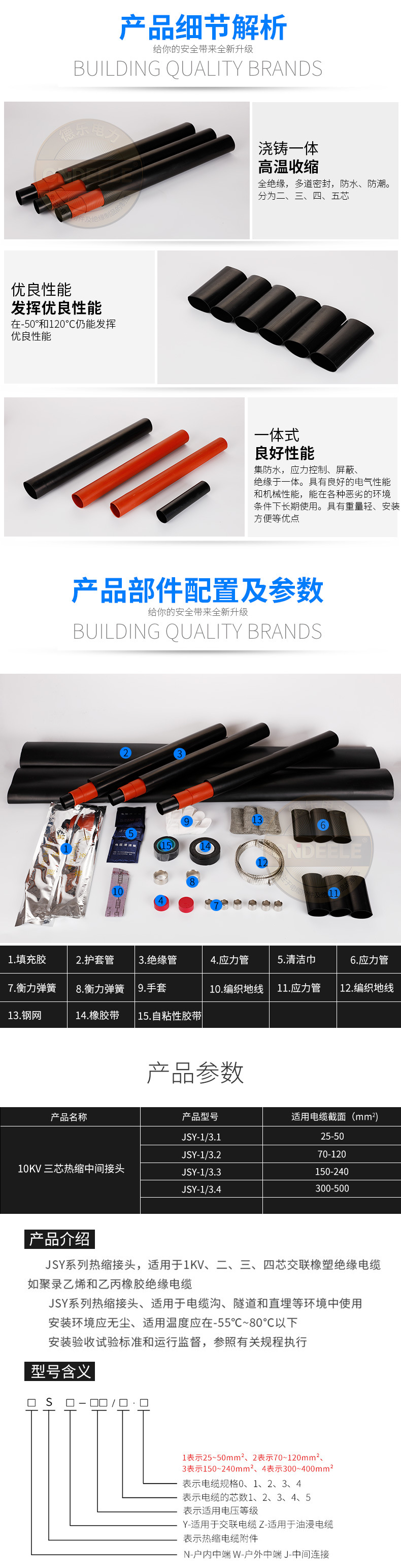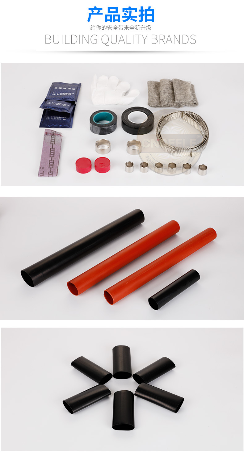 10KV、20KV、35KV熱縮電力電纜終端頭、中間接頭系列產(chǎn)品,集防水、應力控制、絕緣于一體。具有良好的電氣性能和機械性能,能在各種惡劣的環(huán)境條件下長(cháng)期使用。具有重量輕、安裝方便等優(yōu)點(diǎn)。廣泛地應用電力、石油化工、治金、鐵路港口和建筑領(lǐng)域。 熱縮電纜附件俗稱(chēng)熱縮電纜頭,廣泛用于35KV及熱縮電纜附件熱縮電纜附件以下電壓等級的交聯(lián)電纜或油浸電纜的中間連接和終端上。與傳統電纜附件相比具有體積小、重量輕、安全可靠、安裝方便等特點(diǎn)。產(chǎn)品符合GB11033標準,長(cháng)期使用溫度范圍為-55℃~105℃,老化壽命長(cháng)達20年,徑向收縮率≥50%,縱向收縮率<5%,收縮溫度為110℃~140℃。