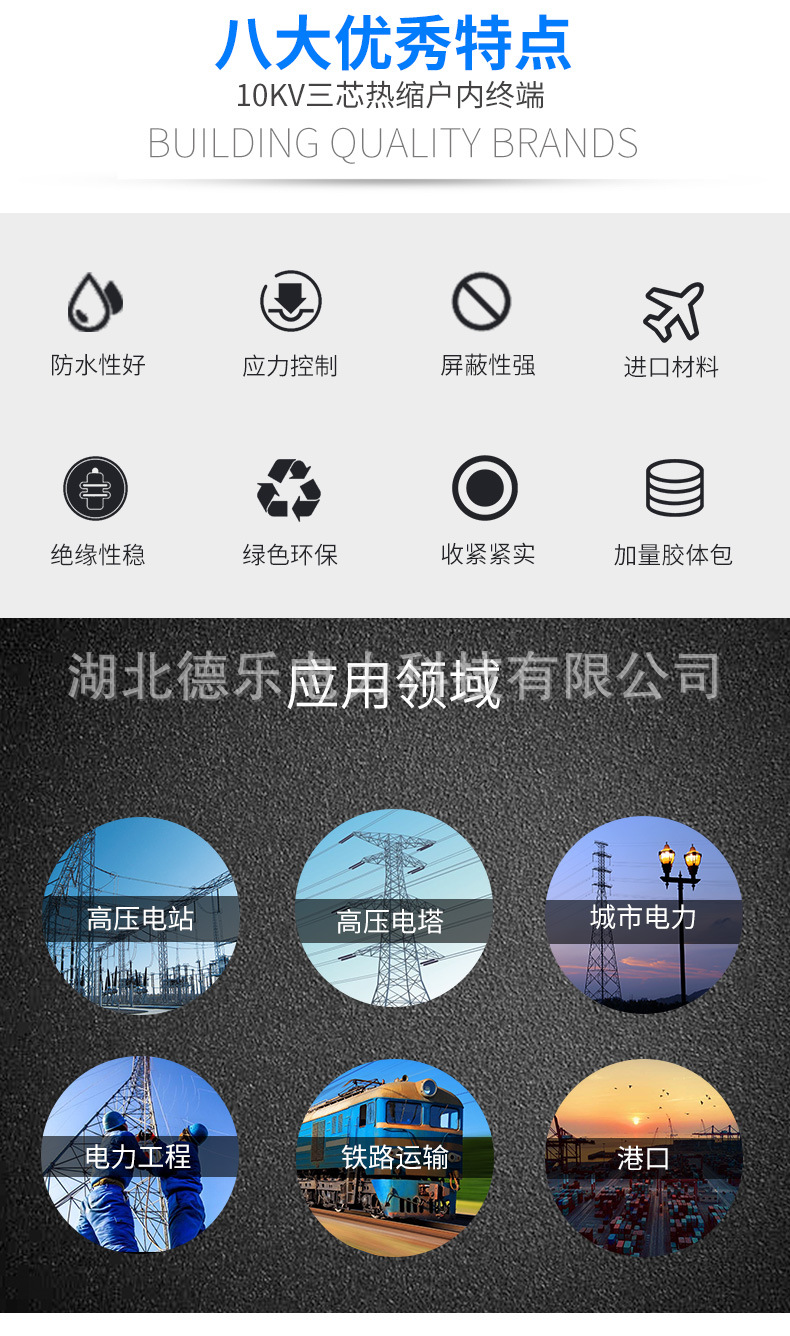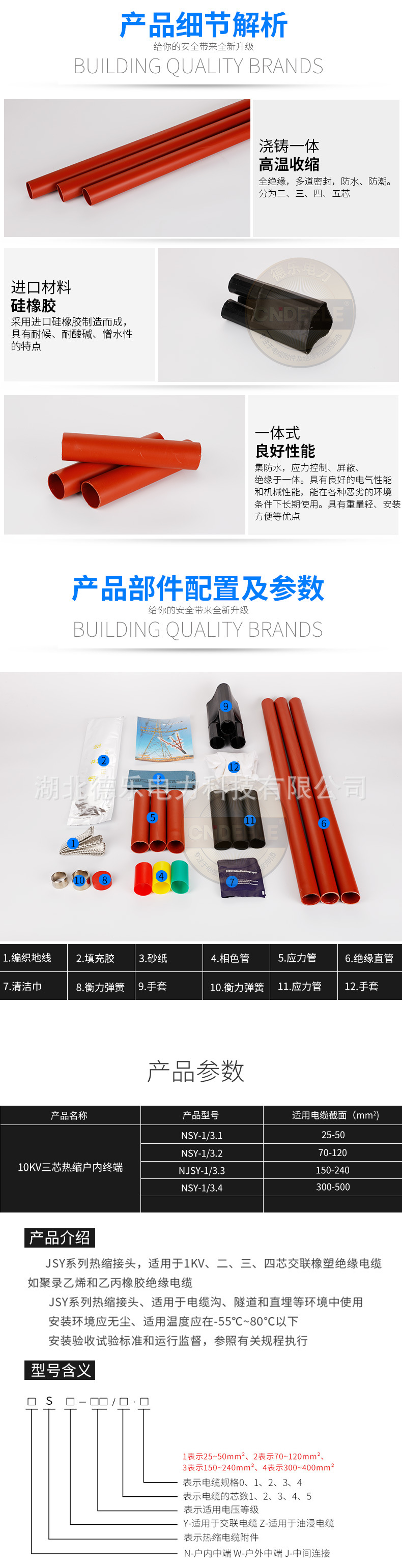 10KV、20KV、35KV熱縮電力電纜終端頭、中間接頭系列產(chǎn)品,集防水、應力控制、絕緣于一體。具有良好的電氣性能和機械性能,能在各種惡劣的環(huán)境條件下長(cháng)期使用。具有重量輕、安裝方便等優(yōu)點(diǎn)。廣泛地應用電力、石油化工、治金、鐵路港口和建筑領(lǐng)域。 熱縮電纜附件俗稱(chēng)熱縮電纜頭,廣泛用于35KV及熱縮電纜附件熱縮電纜附件以下電壓等級的交聯(lián)電纜或油浸電纜的中間連接和終端上。與傳統電纜附件相比具有體積小、重量輕、安全可靠、安裝方便等特點(diǎn)。產(chǎn)品符合GB11033標準,長(cháng)期使用溫度范圍為-55℃~105℃,老化壽命長(cháng)達20年,徑向收縮率≥50%,縱向收縮率<5%,收縮溫度為110℃~140℃。