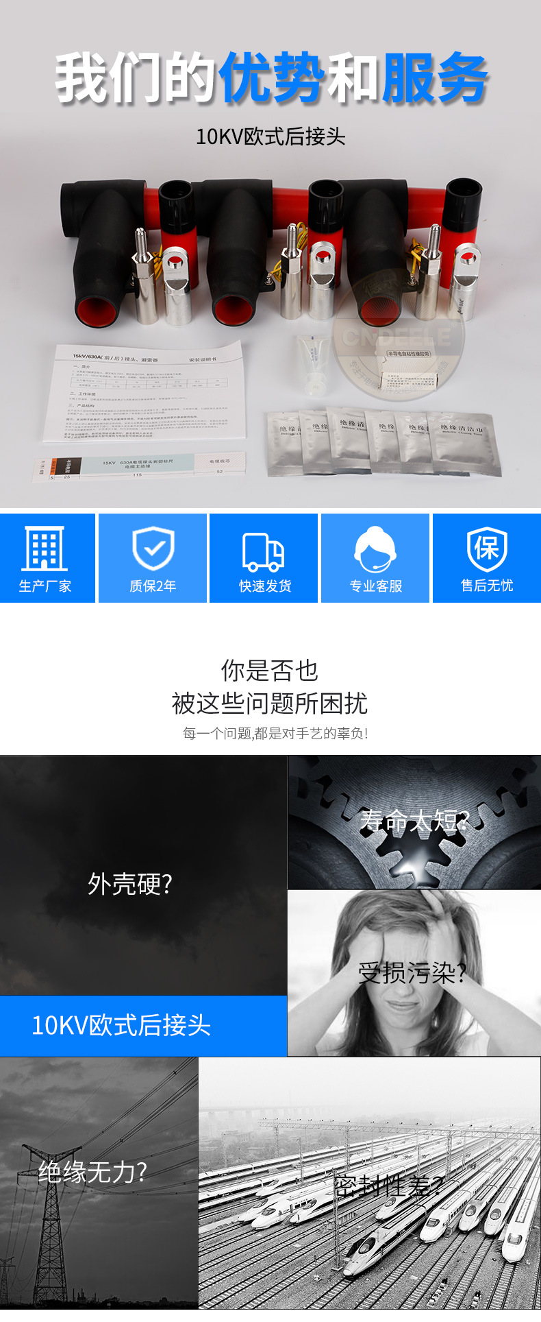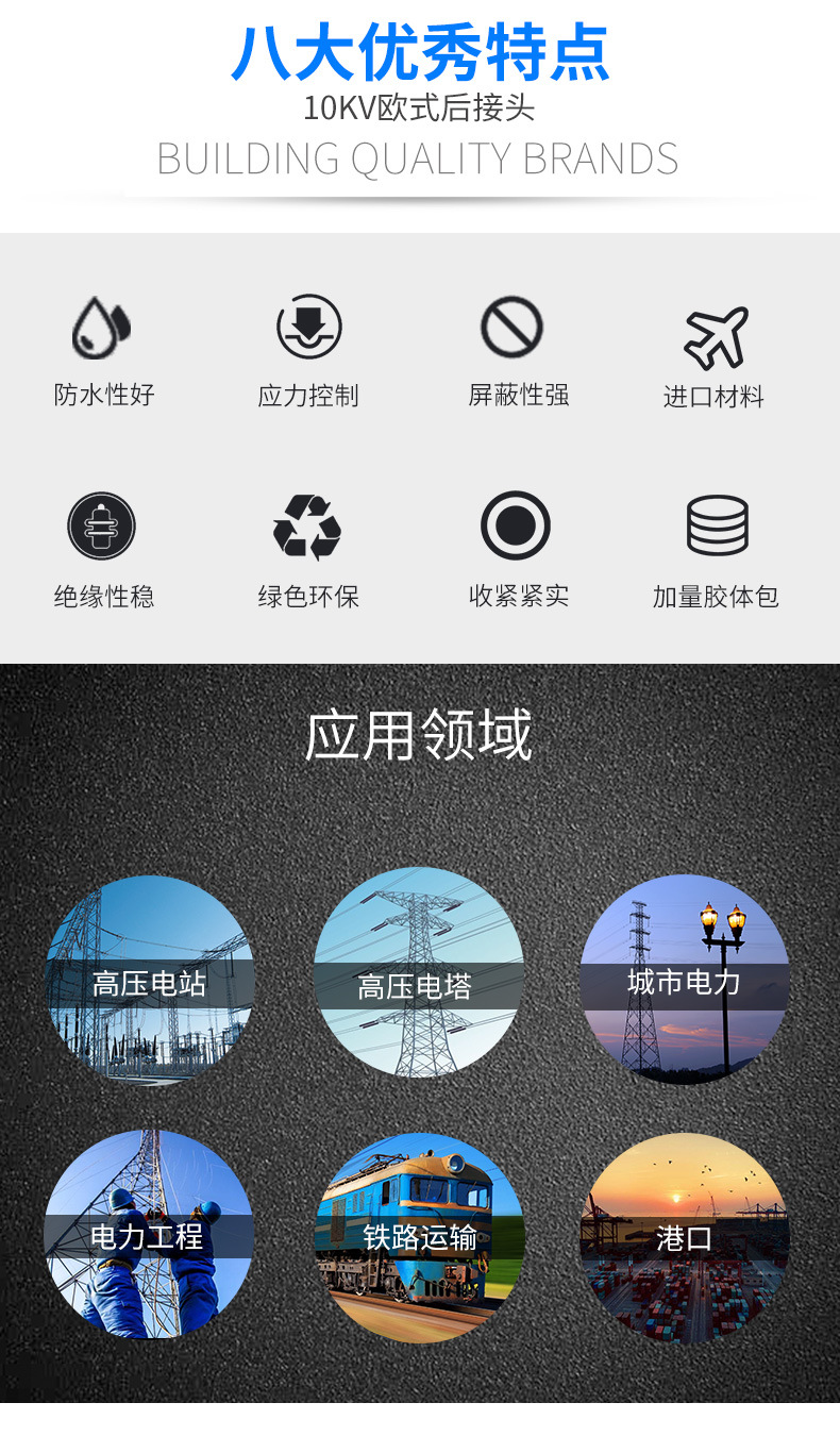 電纜接頭選用EPDM(三元乙丙橡膠)制成,全絕緣.全密封。用于高壓地下電纜連接設備.如風(fēng)能變電站,環(huán)網(wǎng)柜及電纜分接箱等,其額定電流為630A,可連接相關(guān)規格的電纜,也可以在電纜上加裝電纜型故障指示器,能快速準確的查找故障點(diǎn)。 絕緣層:特有配方和混合技術(shù)確保預制EPDM絕緣橡膠的優(yōu)質(zhì)品質(zhì)。 外半導電層:預制的EPDM導電橡膠符合lEEE592標準。 避雷器芯子:由經(jīng)過(guò)特殊工藝處理的氧化鋅避雷器閥片組成。 銅質(zhì)底蓋:銅質(zhì)底蓋與避雷器外導電層緊密結臺,使避雷器有效防水,并為避智器提供接地點(diǎn)。 接地線(xiàn):避雷器下端自帶的接地線(xiàn),用于將雷電沖擊電壓有效接引到接地位置。 內半導電層:預制的EPDM導電橡膠有效的控制電氣應力。 雙頭螺栓:鍍錫的銅螺栓確保導體和套管緊密配合。 絕緣子端蓋:使產(chǎn)品具有絕緣密封作用。