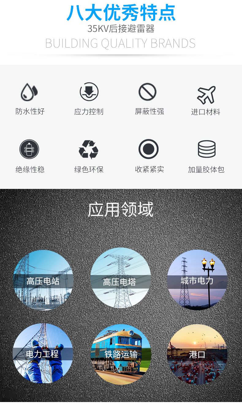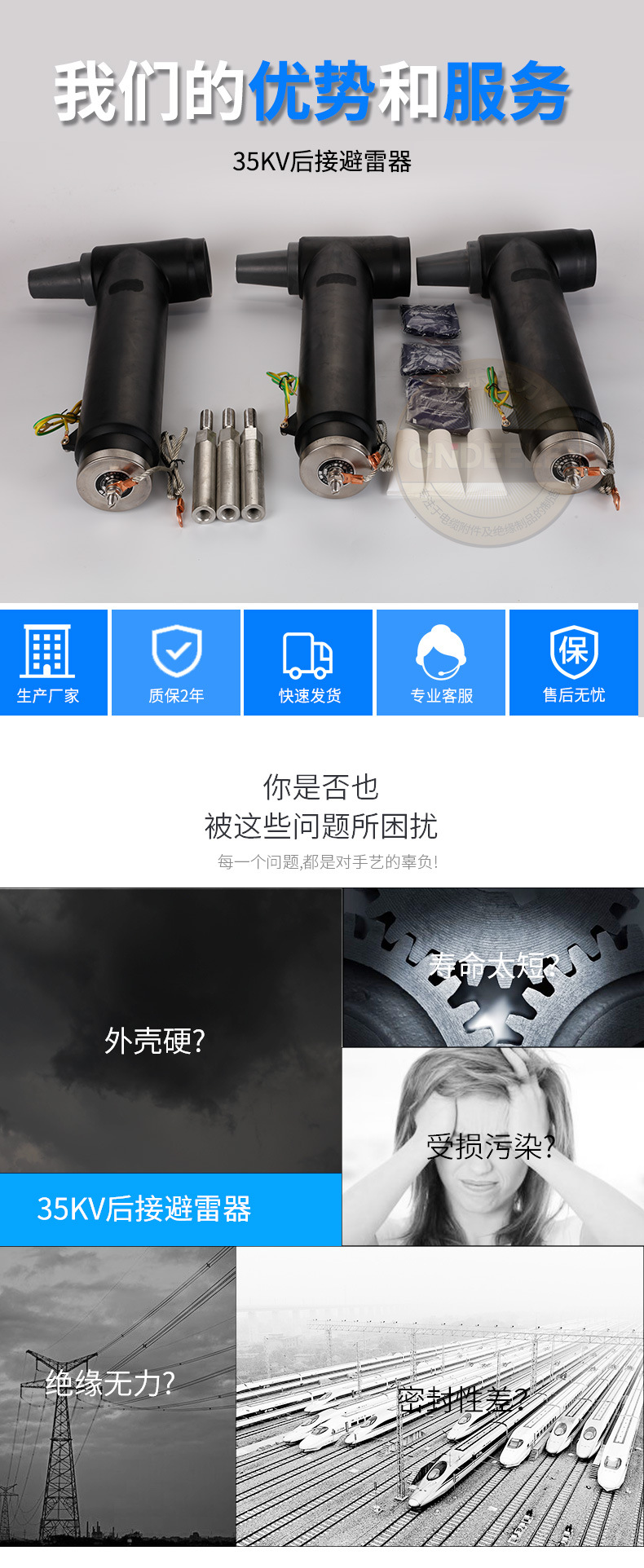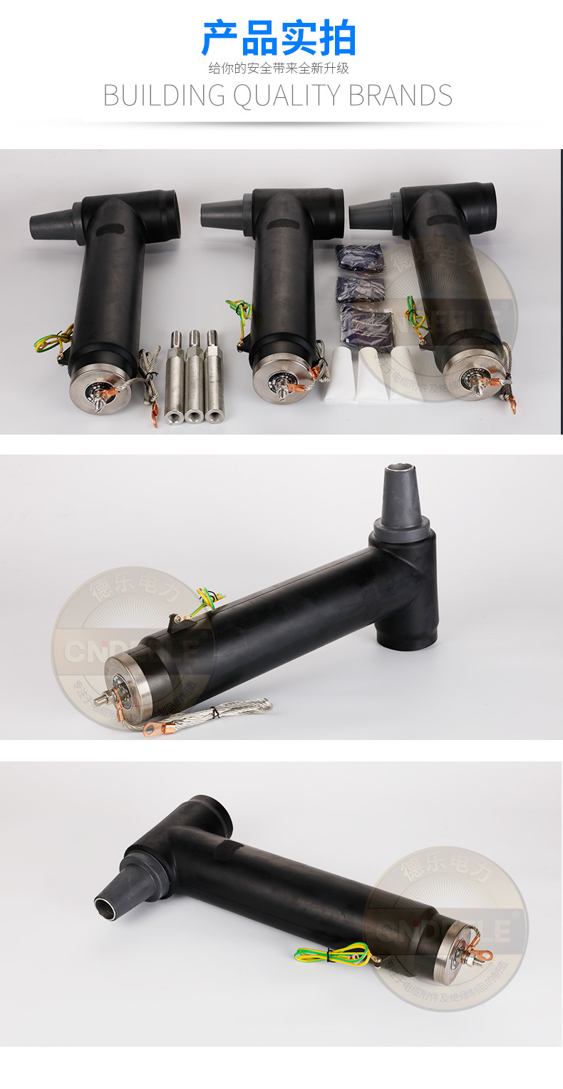電纜接頭選用EPDM(三元乙丙橡膠)制成,全絕緣.全密封。用于高壓地下電纜連接設備.如風(fēng)能變電站,環(huán)網(wǎng)柜及電纜分接箱等,其額定電流為630A,可連接相關(guān)規格的電纜,也可以在電纜上加裝電纜型故障指示器,能快速準確的查找故障點(diǎn)。 絕緣層:特有配方和混合技術(shù)確保預制EPDM絕緣橡膠的優(yōu)質(zhì)品質(zhì)。 外半導電層:預制的EPDM導電橡膠符合lEEE592標準。 避雷器芯子:由經(jīng)過(guò)特殊工藝處理的氧化鋅避雷器閥片組成。 銅質(zhì)底蓋:銅質(zhì)底蓋與避雷器外導電層緊密結臺,使避雷器有效防水,并為避智器提供接地點(diǎn)。 接地線(xiàn):避雷器下端自帶的接地線(xiàn),用于將雷電沖擊電壓有效接引到接地位置。 內半導電層:預制的EPDM導電橡膠有效的控制電氣應力。 雙頭螺栓:鍍錫的銅螺栓確保導體和套管緊密配合。 絕緣子端蓋:使產(chǎn)品具有絕緣密封作用。