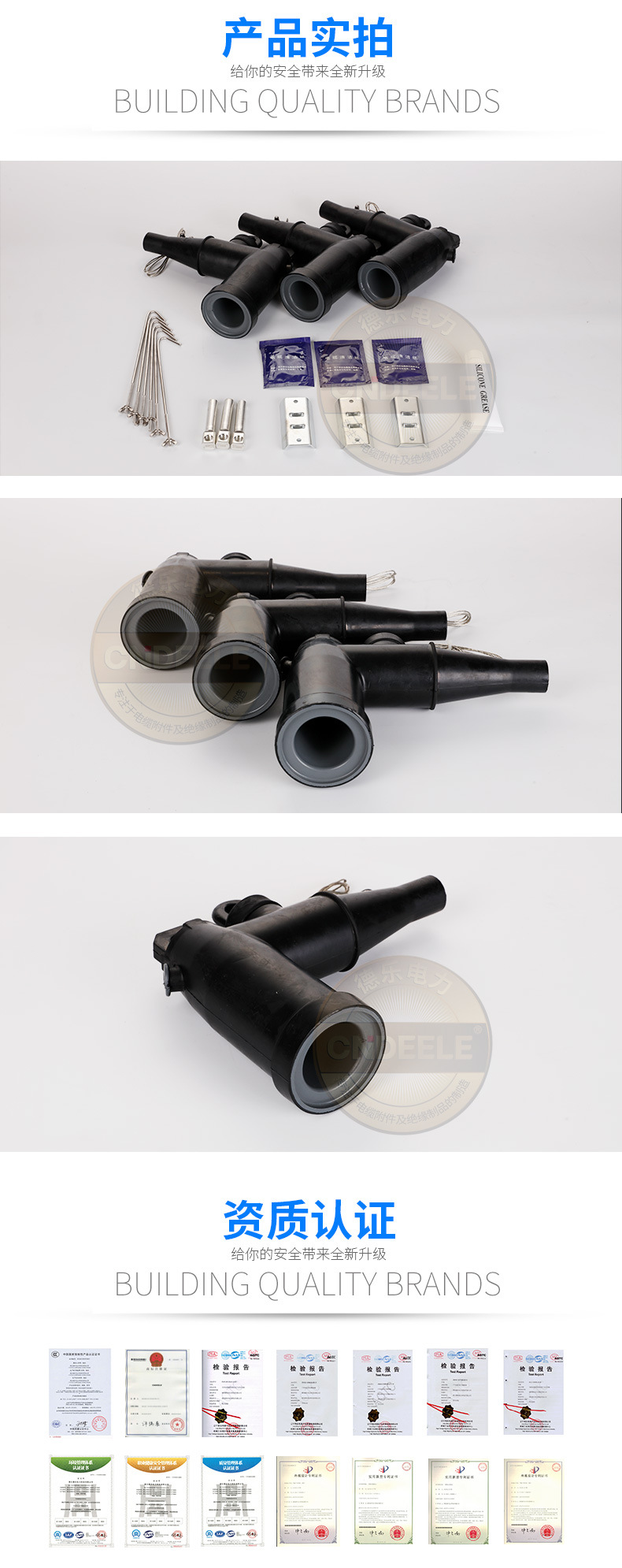 電纜接頭選用EPDM(三元乙丙橡膠)制成,全絕緣.全密封。用于高壓地下電纜連接設備.如風(fēng)能變電站,環(huán)網(wǎng)柜及電纜分接箱等,其額定電流為630A,可連接相關(guān)規格的電纜,也可以在電纜上加裝電纜型故障指示器,能快速準確的查找故障點(diǎn)。 絕緣層:特有配方和混合技術(shù)確保預制EPDM絕緣橡膠的優(yōu)質(zhì)品質(zhì)。 外半導電層:預制的EPDM導電橡膠符合lEEE592標準。 避雷器芯子:由經(jīng)過(guò)特殊工藝處理的氧化鋅避雷器閥片組成。 銅質(zhì)底蓋:銅質(zhì)底蓋與避雷器外導電層緊密結臺,使避雷器有效防水,并為避智器提供接地點(diǎn)。 接地線(xiàn):避雷器下端自帶的接地線(xiàn),用于將雷電沖擊電壓有效接引到接地位置。 內半導電層:預制的EPDM導電橡膠有效的控制電氣應力。 雙頭螺栓:鍍錫的銅螺栓確保導體和套管緊密配合。 絕緣子端蓋:使產(chǎn)品具有絕緣密封作用。